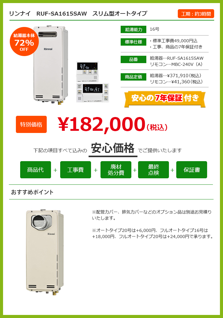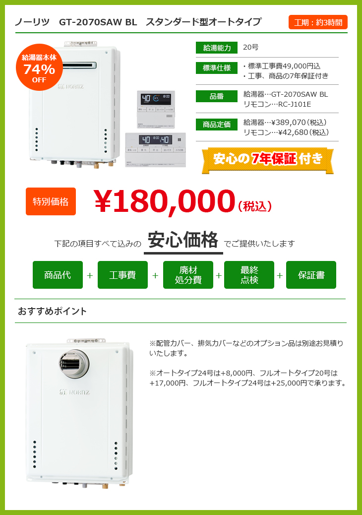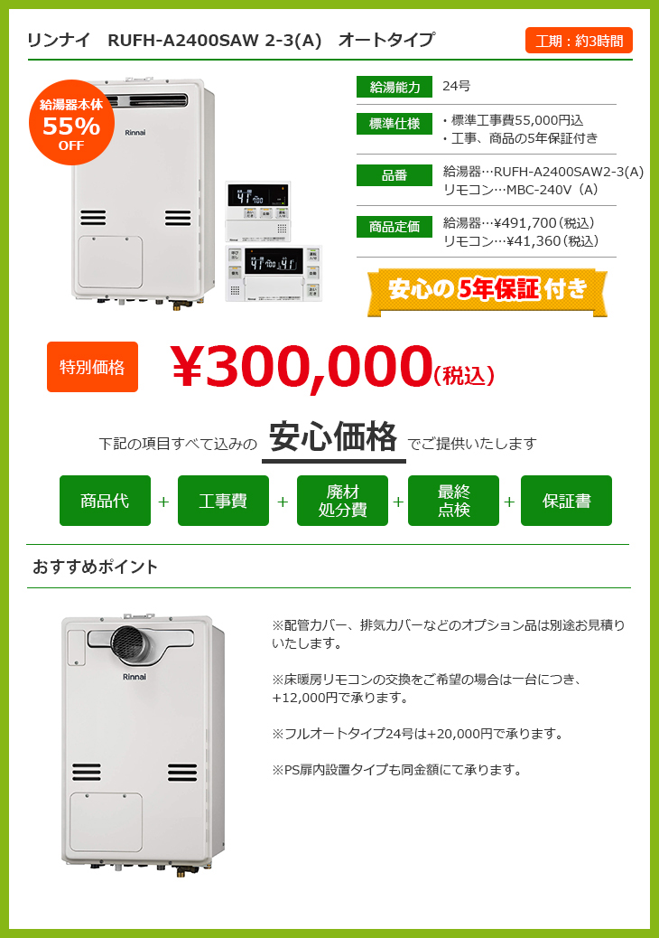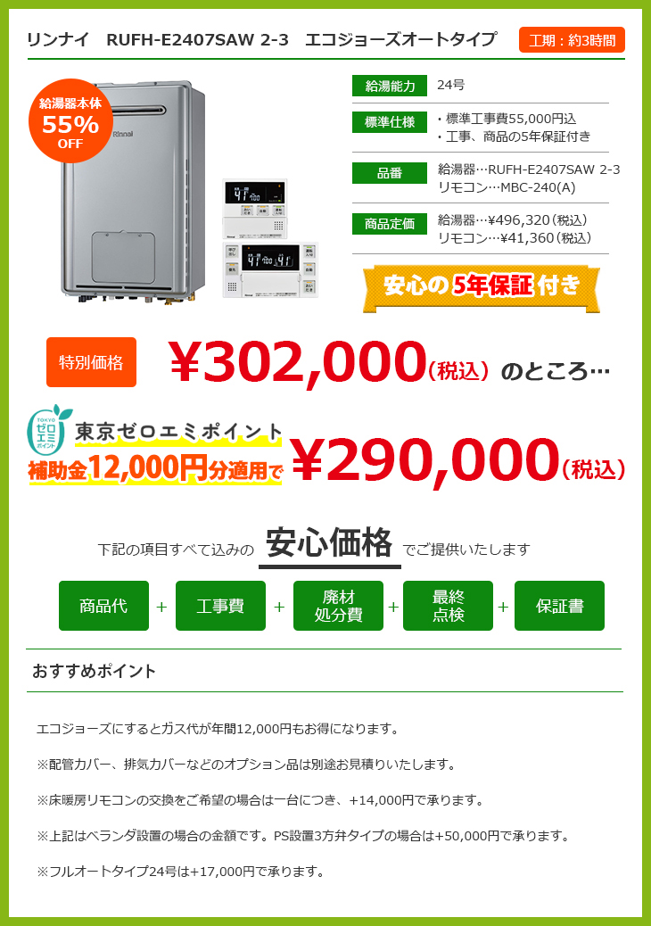 お問い合わせはこちら LINEで見積もり HOME給湯器交換キャンペーンマンション用給湯器交換キャンペーン マンション用給湯器交換キャンペーン 給湯+追い炊き機能をお使いの方 給湯器の号数って? オート、フルオートタイプの違いって? 給湯器の号数って? オート、フルオートタイプの違いって? 給湯+追い炊きほか床暖房・ガス浴室暖房をお使いの方 給湯器の号数って? オート、フルオートタイプの違いって? 給湯器の号数って? オート、フルオートタイプの違いって? 東京ゼロエミポイント制度って? 給湯器の号数って? オート、フルオートタイプの違いって? 東京ゼロエミポイント制度って? 給湯器の号数って? オート、フルオートタイプの違いって? 東京ゼロエミポイント制度について 東京ゼロエミポイントとは? 設直済みのエアコン・冷蔵庫・給湯器・照明器具を、省エネ性能の高い新品の対象家電等に買替える際に東京都が補助してくれる制度です。給湯器の場合は、省エネ型給湯器エコジョーズ購入時に、12,000円の補助金が出ます。 申請手続きは当社が行いますので、面倒な手続きは不要です。東京都民であることがわかる運転免許証などの身分証のコピーを工事当日にご提出いただきますので、あらかじめご準備をお願いいたします。 給湯器の号数について 給湯器の号数とは? 給湯器の号数とは「1分間に水温+25℃のお湯を何リットル出すことができるか」を表した数値です。 家庭用の給湯器としては、16号、20号、24号が主な号数で、数字が大きいほうがお湯を作るの力が高く、たくさんのお湯を使うことができます。 例えば、下記のような記載がされているはずです。 16号の場合…GT-168AW・RUF-A1610SAW・TP-SQ166B-1・OURB-1651SAQ、 20号の場合…GT-2027SAWX・RUF-2006SAW・GTH-2034AWXD・FH-20AWD・GH-S206ZWH、24号の場合…GTH-2417AWX・RUF-V2400SAT-1・GT-2427SAWX-T-1・DH-N2412AWADL4 号数選びの目安 給湯器の号数選びの目安としては、現在お使いいただいている給湯器で、湯量が少ないなどの不便を感じたことがなければ、同じ号数のものを選ぶことがお勧めです。 逆に、湯量が少ないと感じることがある、ご家族が増えた、お子様の進学、就職などで使用する人数が減ったなど、ライフスタイルが変わる場合は、給湯器の号数変更も可能です。 オートタイプとフルオートタイプ オートタイプの特徴 オートタイプは、自動湯はり機能、追い炊き機能を備えているタイプのことを指します。自動湯はり機能とは、設定した温度・湯量の通り自動でお湯をはってくれる機能です。 追い炊き機能とは、設定温度まで温めなおしをする機能です。 また別で足し湯ボタンが用意されており、自分のタイミングで足し湯を行うことが可能です。 フルオートタイプの特徴 フルオートタイプとは、上記のオートタイプに自動足し湯機能が加わったタイプのことを指します。 自動足し湯機能とは、入浴により減ってしまったお湯を、設定水位まで自動で追加する機能です。またフルオートタイプには自動配管クリーン機能がついており、浴槽のお湯を排水した際に自動で配管からお湯を出して配管内をきれいにします。 有限会社加瀬商会について 選ばれる理由 会社案内代表挨拶会社概要アクセスマップ ブログ スタッフ紹介 地域とのつながり 【加瀬商会】採用ページ 施工事例 施工事例一覧 キッチンリフォーム 浴室リフォーム 洗面台リフォーム トイレリフォーム 給湯器設置 内装リフォーム 外装リフォーム エクステリアリフォーム プチリフォーム プチリフォーム レンジフード プチリフォーム ガスまわり プチリフォーム ガスコンロ プチリフォーム 水廻り編 お客様の声 お客様の声一覧 お役立ち情報 ユニットバス ¥422,000(税込) 洗面台 ¥107,000~(税込) LINEリフォーム相談・見積もり バランス釜、浴槽交換キャンペーン 超プチリフォーム メニュー表 リフォーム価格表 最新チラシ 一覧 リフォームの流れ よくある質問 ブログ お問い合わせ お問い合わせ 無料お見積もり